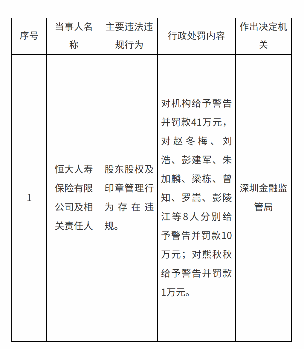 同日,深圳金融监管局发布的行政处罚决定书显示,恒大人寿在股东股权及印章管理方面存在违规。该局对恒大人寿给予警告,并处41万元罚款;对赵冬梅、刘浩、彭建军、朱加麟、梁栋、曾知、罗嵩、彭陵江8人分别给予警告,各处罚款10万元;对熊秋秋给予警告,罚款1万元。其中,恒大人寿前董事长彭建军同时出现在两部门处罚名单中。