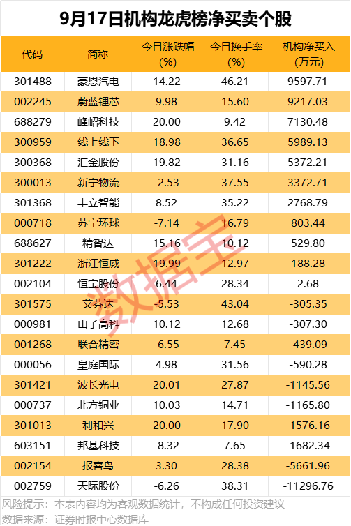 今日龙虎榜中,净买入的个股11只,净卖出的个股10只。豪恩汽电、蔚蓝锂芯净买入金额均超9000万元。