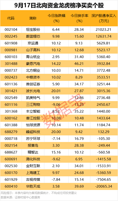 今日龙虎榜现身个股中,16股获北向资金净买入。净买入居首的是恒宝股份(维权),金额为2.1亿元;蔚蓝锂芯、京运通、山子高科等均获净买入超5000万元。