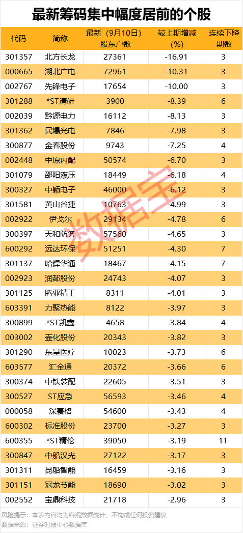 从最新一期股东户数下降幅度看,降幅较大的有北方长龙、湖北广电、先锋电子等,最新股东户数分别下降16.91%、10.31%、10%。