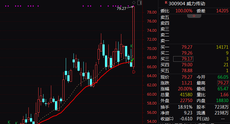 午后,风电设备板块走强,威力传动(300904)20cm涨停,吉鑫科技2连板,明阳智能涨停,日月股份、盘古智能、天能重工、天顺风能等涨幅居前。