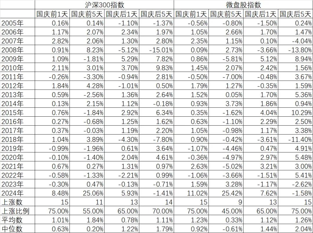 以下统计了从2005年到2024年这20年来代表最大企业的沪深300指数和代表最小企业的微盘股指数在国庆前1天、前5天和国庆后1天,后5天的上涨比例、平均数和中位数: