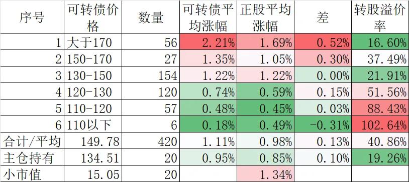 420只可转债平均上涨1.11%,对应正股平均上涨0.98%。我的主仓20只可转债平均上涨0.95%,对应正股平均上涨0.85%。