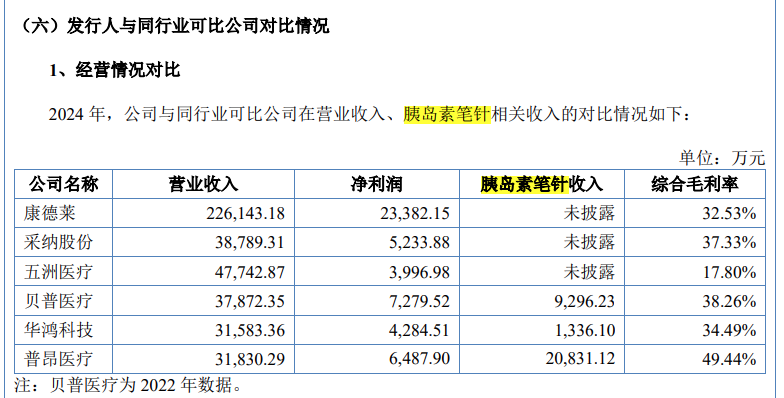 根据问询回复函披露,普昂医疗的同行业可比公司有五家,分别为康德莱(603987)、华鸿科技、五洲医疗(301234)、贝普医疗、采纳股份(301122)。其中,康德莱为同行中的龙头企业,2024年营收22.61亿元,为普昂医疗同年营收(3.18亿元)的7.11倍。