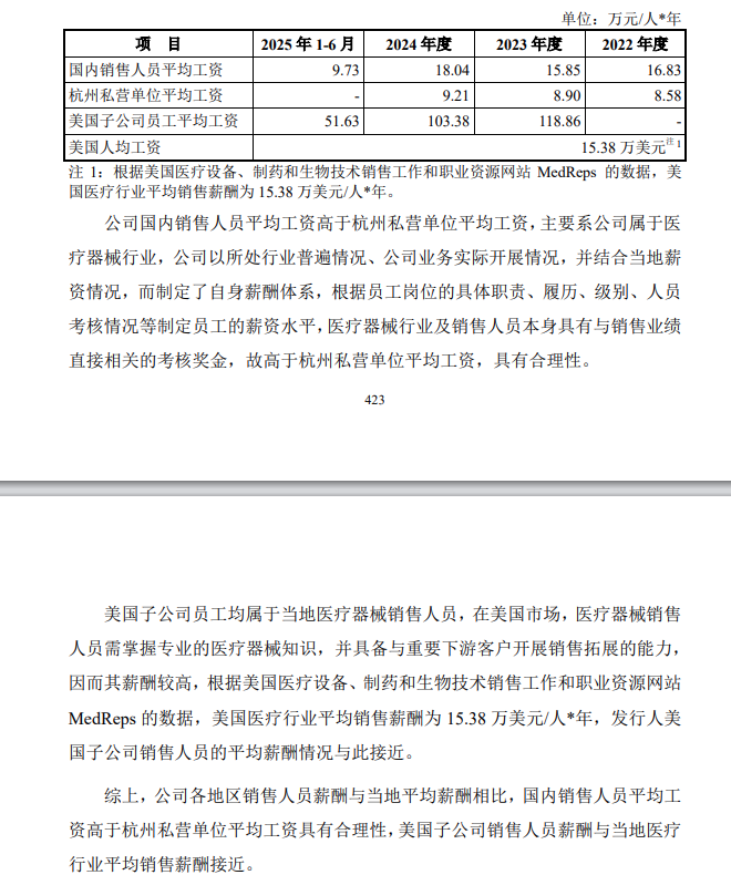 根据问询回复函,普昂医疗截至2024年末的销售人员总共有61人,其中国内公司55人、美国子公司6人。公司国内销售人员平均工资2022-2024年分别为16.83万元、15.85万元、18.04万元,而公司所处杭州私营单位平均公司分别为8.58万元、8.9万元、9.21万元。