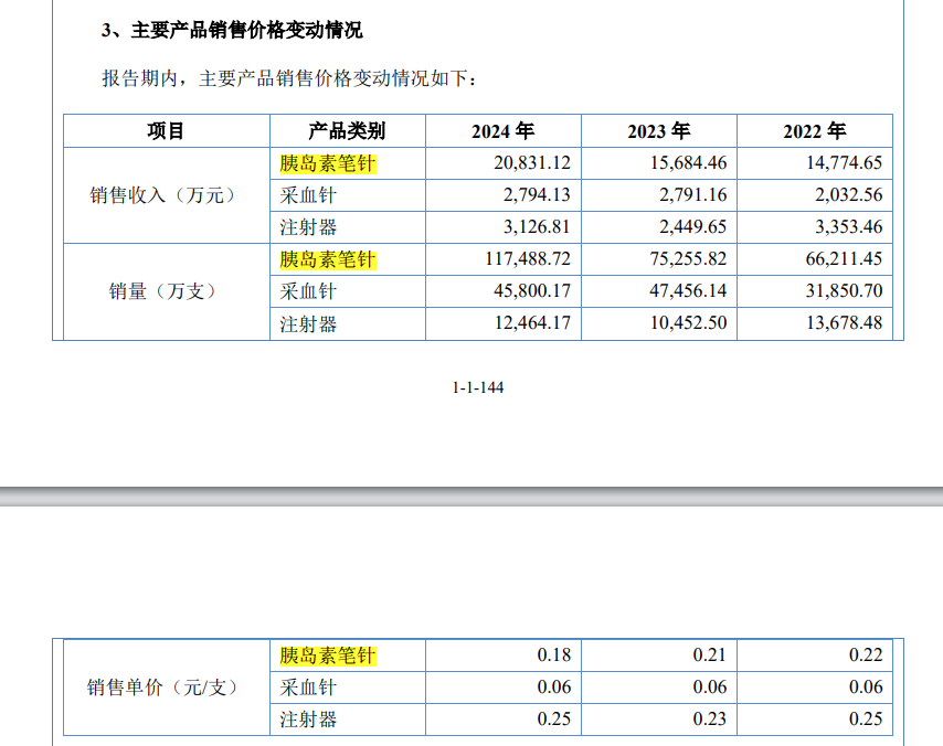 报告期内胰岛素笔针产品是公司销售占比最高的产品类别,2024年该产品销售额占主营业务收入的比重为65.8%。胰岛素笔针产品销售额虽然从2022年的1.48亿元增加至2024年的2.08亿元,但销售单价却是逐年下降,2022-2024年分别为0.22元/支、0.21元/支、0.18元/支。