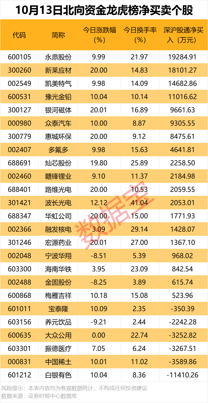 今日龙虎榜现身个股中,19股获北向资金净买入。净买入居首的是永鼎股份,金额为1.93亿元;新莱应材(维权)、凯美特气、豫光金铅均获净买入超1亿元。