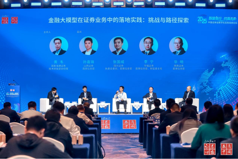 由证券时报社主办的“2025中国证券业数字化实践高峰论坛”近期在北京举行,在主题为“金融大模型在证券业务中的落地实践:挑战与路径探索”的圆桌论坛环节上,多家券商首席信息官分享了人工智能大模型在证券行业的应用进展与思考。