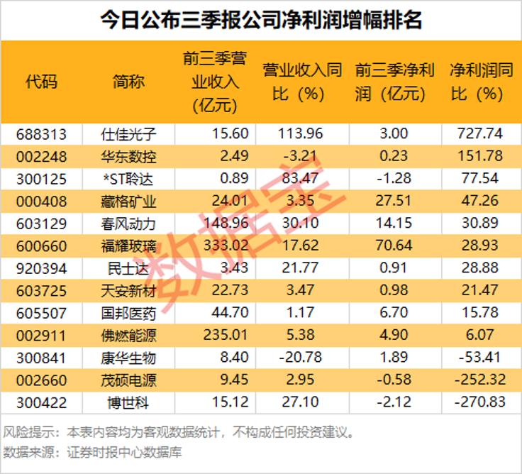 统计显示,今日(10月17日)共13家公司发布三季报。净利润增幅居前的有仕佳光子、华东数控等。