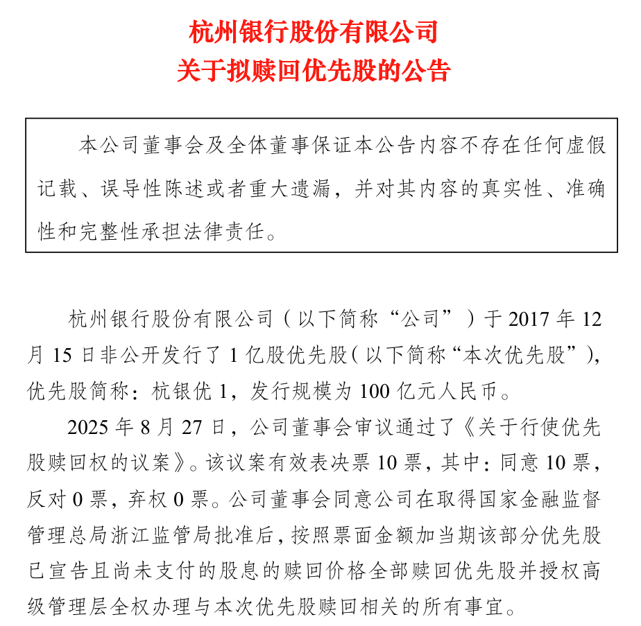 10月20日,杭州银行(600926)发布一则关于优先股赎回的公告,称已收到国家金融监督管理总局浙江监管局对赎回“杭银优1”优先股的无异议意见,计划于2025年12月15日全额赎回该批优先股,对应的赎回规模为100亿元人民币。根据公告披露,此次赎回价格将按照“票面金额加当期该部分优先股已宣告且尚未支付的股息”确定,这一安排也符合该优先股发行时的相关约定。