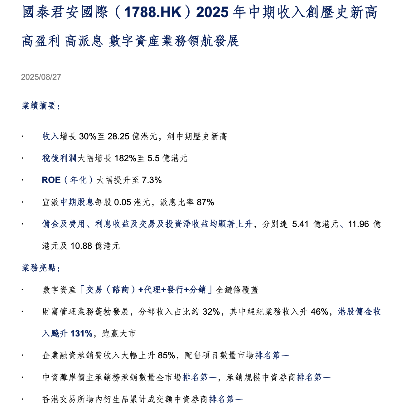 可见,包括中信证券、中信建投、中金公司和华泰证券(601688)在内的“三中一华”仍在香港市场中占有绝对优势。而另一家头部券商——2025年完成吸收合并的国泰海通(601211),在港竞争力同样不容忽视,其在港股衍生品领域表现突出,2025年上半年交易量同比实现显著增长,位居中资券商第一。另外,国泰海通还积极拓展数字资产服务领域,获得香港证监会批准,开展虚拟资产相关产品的发售、发行与分销业务,并计划向客户分销代币化证券或提供相关意见。