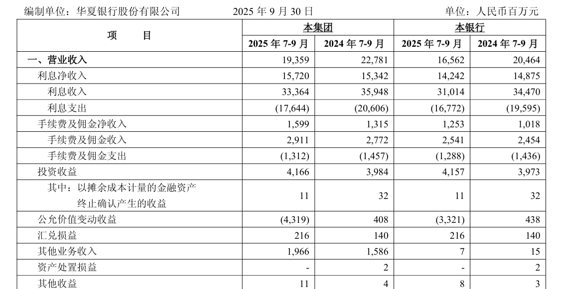 10月23日晚间,华夏银行(600015)发布2025年三季报,数据显示,2025年1-9月该行实现营业收入648.8亿元,同比下降8.8%;归属于上市公司股东的净利润179.8亿元,同比下降2.9%,这已是该行自2025年一季报起连续第三个报告期交出营收、净利润双双下降的答卷。