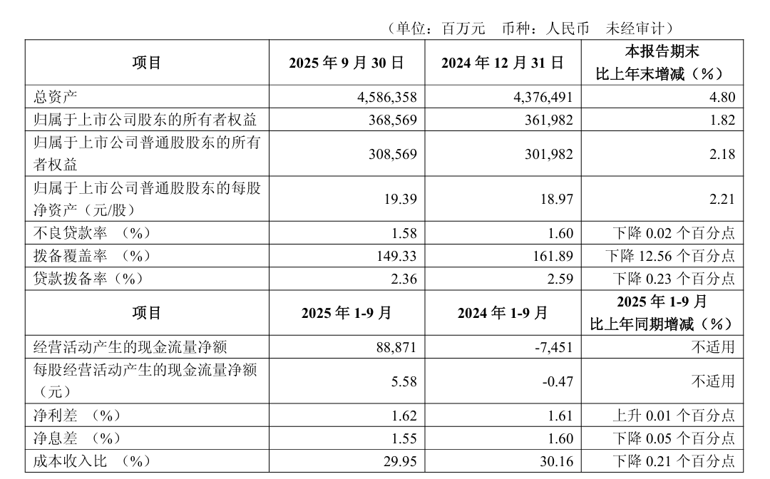 从贷款资产质量细节看,截至2025年9月30日,该行不良贷款余额384.6亿元,较2024年末的379.1亿元增长1.43%;不良贷款率1.58%,较2024年末的1.60%微降0.02个百分点;正常类贷款占比96.10%,较2024年末提升0.28个百分点,资产质量指标表面保持平稳态势。