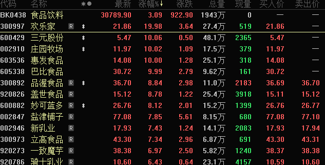 美容护理板块龙头爱美客盘中一度涨超8%,收盘涨幅4.92%;食品饮料板块中,欢乐家收获“20cm”涨停板,三元股份、庄园牧场、舍得酒业、惠发食品(维权)、会稽山、酒鬼酒等涨停;商贸零售板块中,免税龙头中国中免涨停,浙江东日、国光连锁、东百集团、步步高(维权)、家家悦等涨超5%。