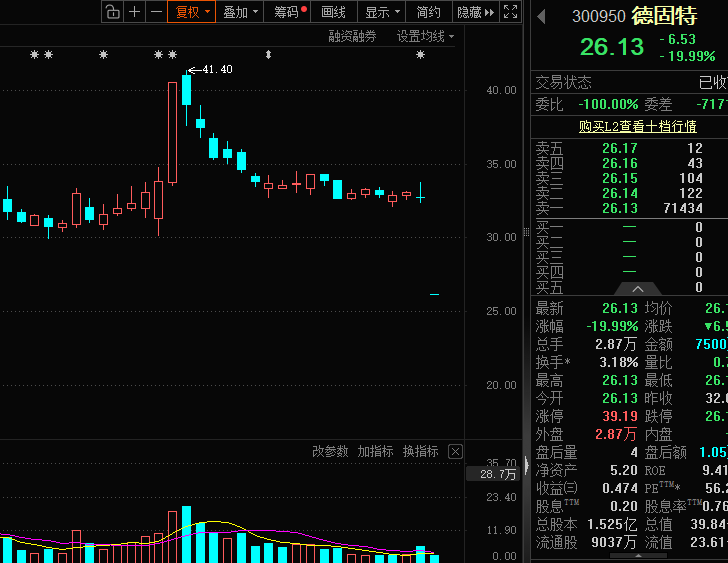 11月10日,德固特(300950)“一”字跌停,这是其上市以来首个“一”字跌停,收盘时跌停板封单7.14万手。公司股价如此大幅下跌,与其筹划数月的重大资产重组或将终止有关。