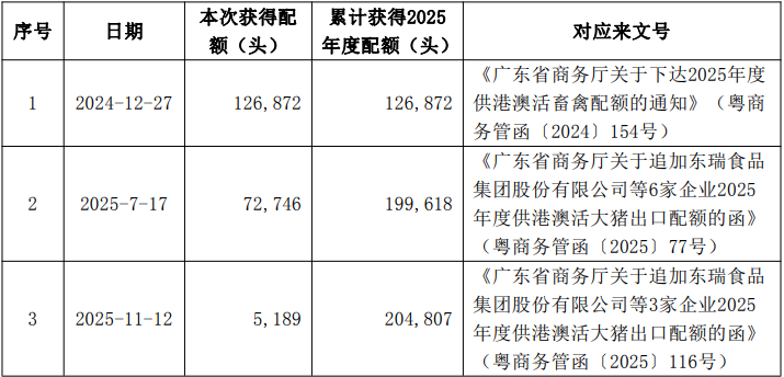 11月13日,东瑞股份(001201)发布公告,近日获得广东省商务厅批准,追加2025年度供港活大猪出口配额5189头。截至本公告日,公司累计获得2025年度供港配额20.48万头,具体情况如下: