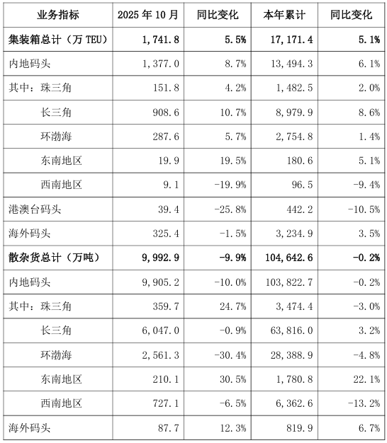11月14日,招商港口(001872/201872)发布公告,披露了2025年10月的业务量数据。根据公告,集装箱总计为1,741.8万TEU,同比增长5.5%;散杂货总计为9993万吨,同比下降9.9%。