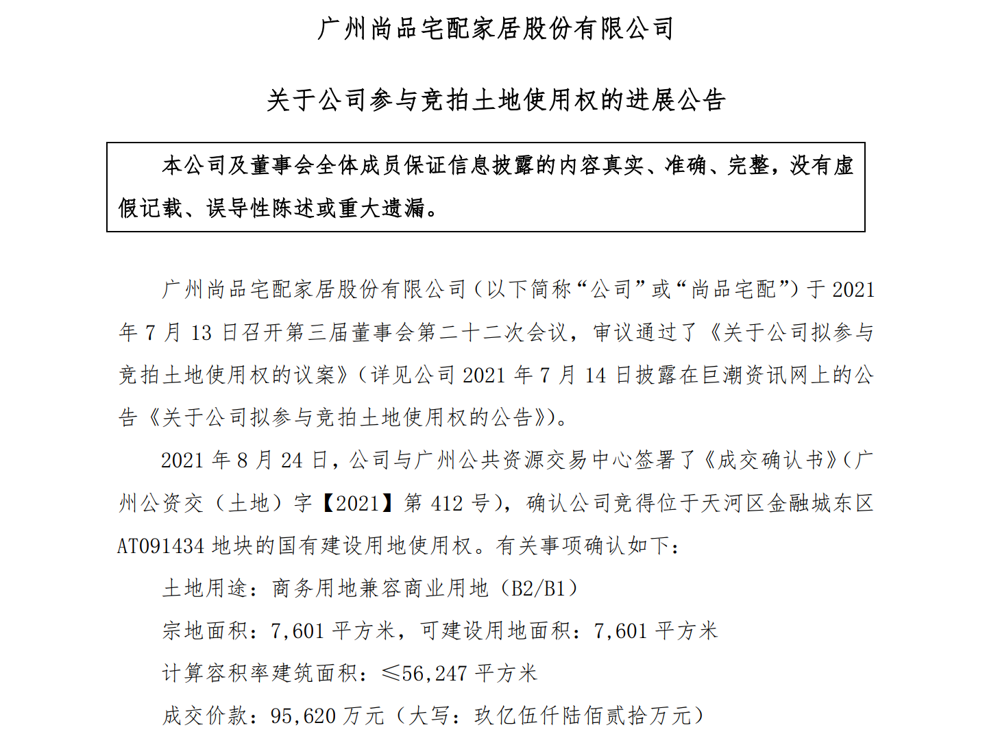 2021年8月,尚品宅配(300616)以9.6亿元在广州天河区成功拍下一幅地块,主要用于总部大楼和全球创新研发基地等用途。