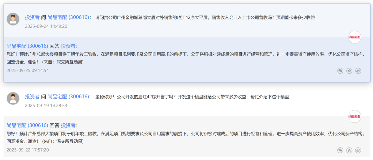 2025年9月底,尚品宅配在投资者关系活动中表示,公司广州总部大楼项目建成后,公司自持物业不得低于项目计算容积率总建筑面积的70%,即其余30%可用于出售。公司已于2025年9月取得相关部分的《预售许可证》。
