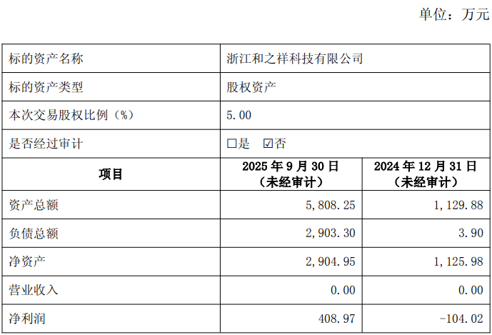 11月18日,祥和实业(603500)发布公告,公司拟以自有资金200万元的价格购买浙江和之祥科技有限公司5%股权。此次交易后,公司将持有和之祥5%股权。