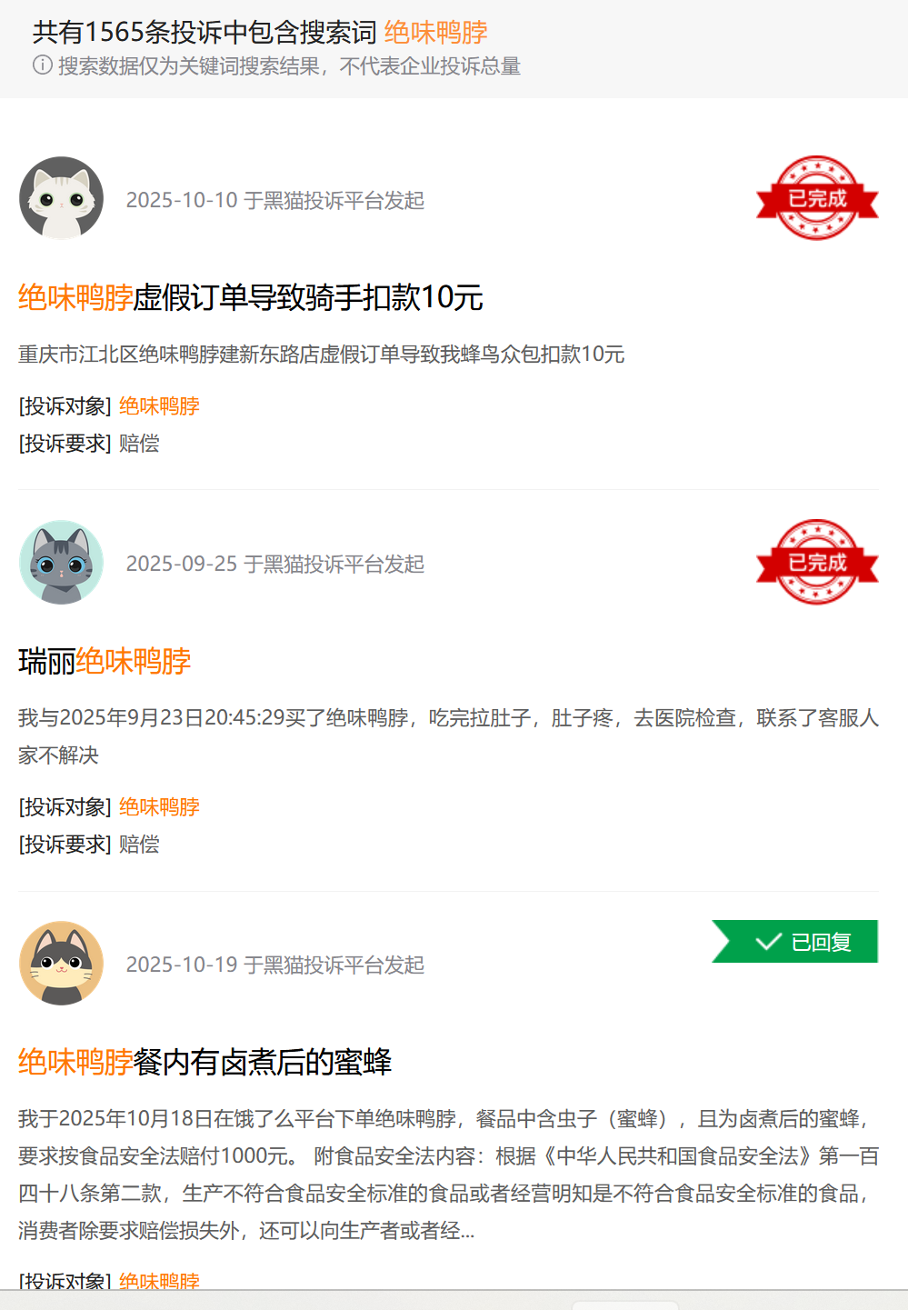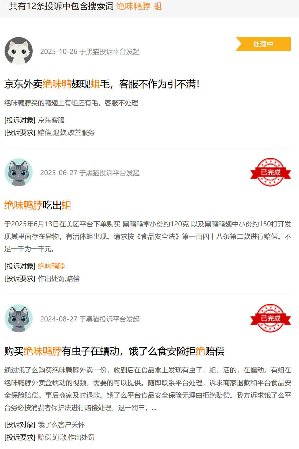 这种敌意正在投诉平台【下载黑猫投诉客户端】集中爆发。黑猫平台上关于绝味的投诉累计已超1560条,完成率不足八成,其中食品质量与安全问题占比过半。消费者反映鸭脖“存在异味不新鲜”,还有人吃出“被煮过的昆虫”。这些真实案例,与计量单位的小动作一起,把信任撕开了一个又一个口子。