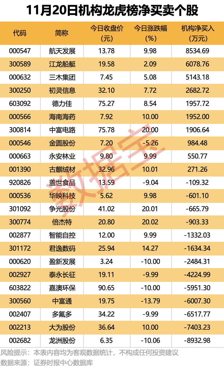 机构净卖出个股中,龙洲股份跌停,遭机构净卖出8932.98万元,居首;随后是大为股份,股价涨停,机构净卖出金额为7403.23万元。