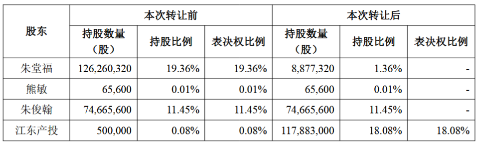 朱堂福向江东产投转让其持有的公司1.18亿股,占公司总股本的18%,转让价格为11.48 元/股,转让价款合计13.48亿元。朱堂福、熊敏、朱俊翰与江东产投签署了表决权放弃协议,约定自股份交割日起,朱堂福、熊敏、朱俊翰无条件且不可撤销地放弃行使所持有的公司全部股份。