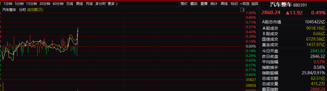 值得注意的是,临近早上10:45时,汽车整车板块亦直线拉升。