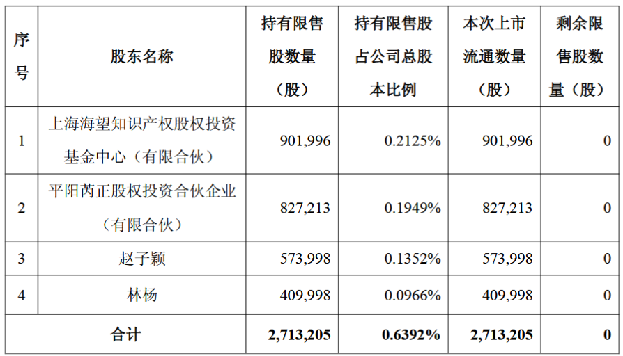 11月27日,康希通信(688653)发布公告,公司4名股东所持271万股首发限售股份将于2025年12月8日上市流通,具体明细清单如下: