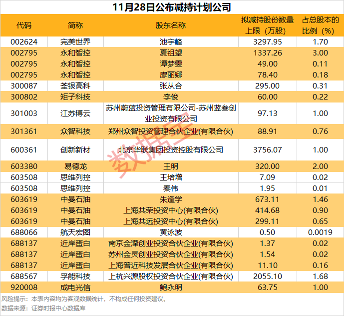 11月28日,14家公司发布了减持计划,拟减持比例居前的有永和智控、中曼石油等。