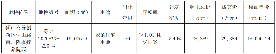 苏州高新(600736)发布公告,公司控股孙公司苏州新京捷置地有限公司于2025年11月28日通过市场竞拍方式成功取得江苏省苏州市苏地2025-WG-Z26号宗地土地使用权,该宗地的成交价为2.94亿元。具体表现如下: