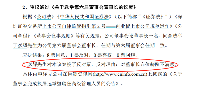 近日,上市公司艾比森发布了《第六届董事会第一次会议决议公告》。该公司创始人、长期担任董事长的丁彦辉再次当选董事长。但在投票环节,这一议案唯一的反对票来自丁彦辉本人。反对理由是“对董事长岗位薪酬不满意”。