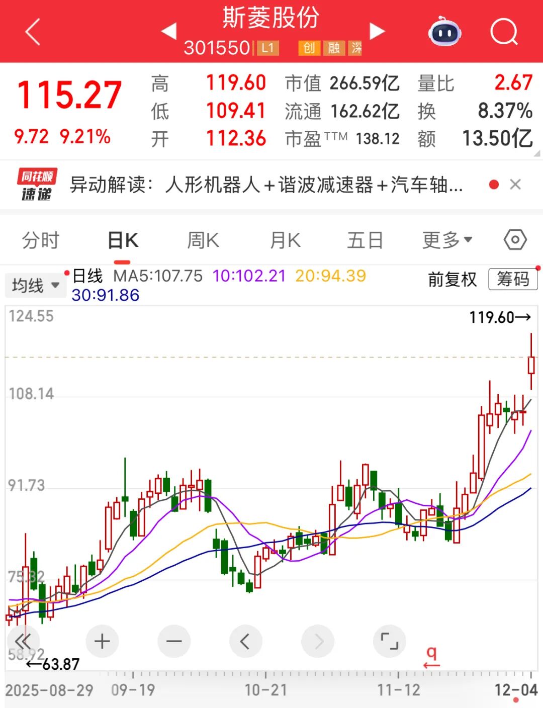 早盘人形机器人相关概念涨幅居前,其中斯菱股份(301550)开盘大涨,盘中最高逼近120元/股,创出历史新高,截至上午收盘涨超9%。