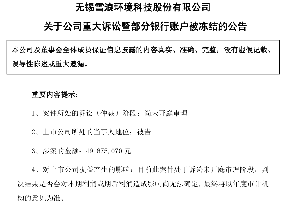 为保障债权实现,苏州银行无锡分行向苏州工业园区人民法院申请了诉前财产保全,法院随即裁定冻结雪浪环境名下价值4967.5万元的银行存款或查封相应价值财产。