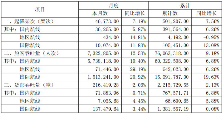 货邮吞吐量方面,本月为22万吨,同比增长2.06%,累计货邮吞吐量为222万吨,同比增长2.13%。具体表现如下: