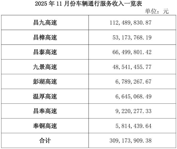 12月12日,赣粤高速(600269)发布公告,公司2025年11月份车辆通行服务收入为3.09亿元。
