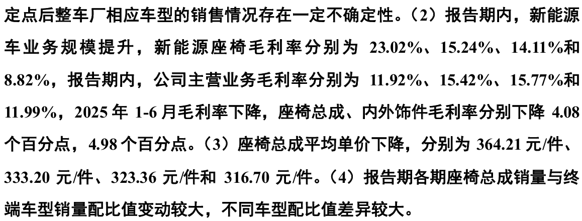 报告期,公司新能源座椅毛利率从2022年的23.02%降至2025年上半年的8.82%;整体主营业务毛利率在2025年上半年回落至11.99%,座椅总成毛利率下降4.08个百分点至10.85%,内外饰件毛利率下降4.98个百分点至12.18%。