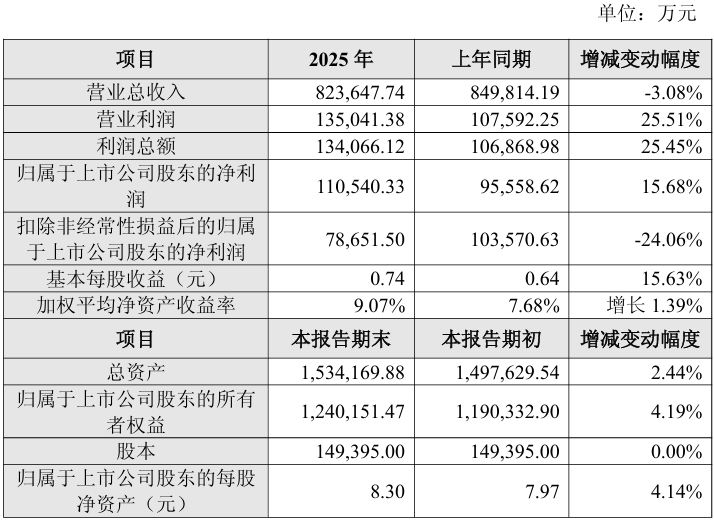 2月6日,天士力(600535)发布公告,2025年度业绩快报显示,公司营业总收入为82.36亿元,同比减少3.08%;归母净利润为11.05亿元,同比增加15.68%。