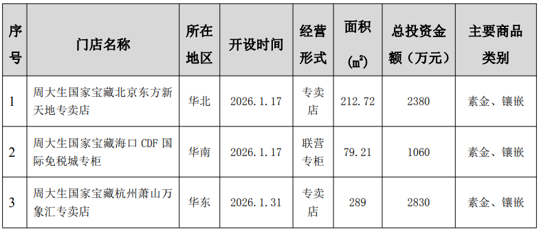 2月9日,周大生(002867)发布公告,2026年1月份公司新增自营门店3家,总投资金额为6270万元,具体情况如下:
