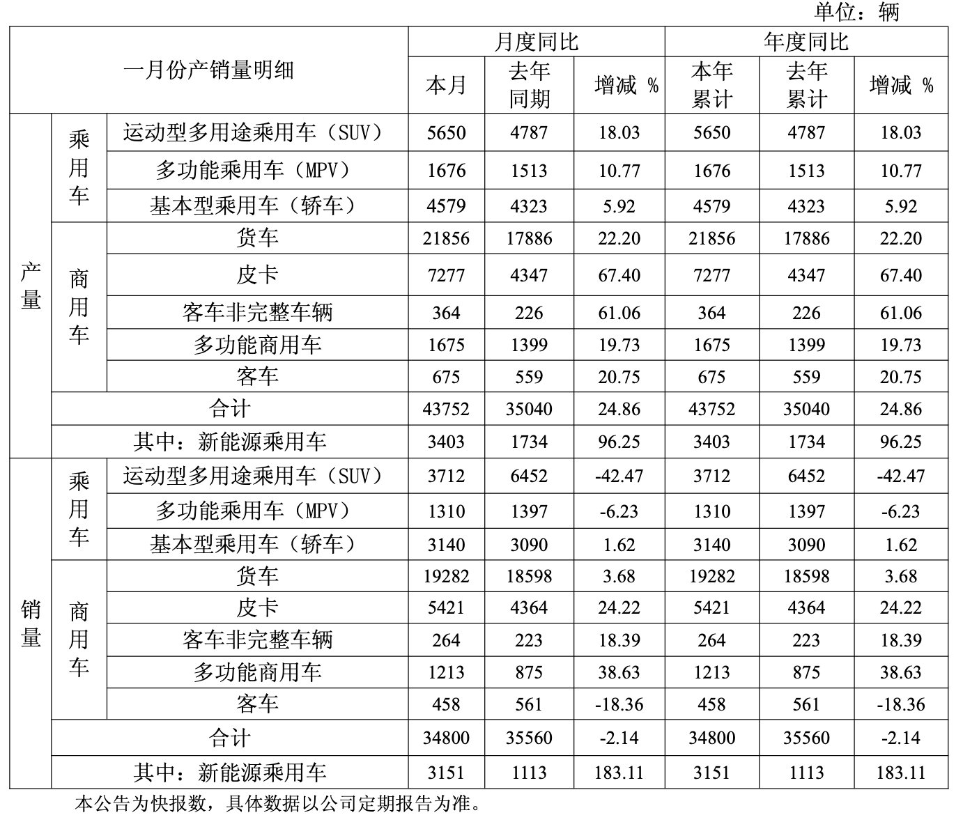 在销售方面,1月份总销量为3.48万辆,较去年同期的3.56万辆下降2.14%,其中,新能源乘用车销量为3151辆,同比增长183.11%。