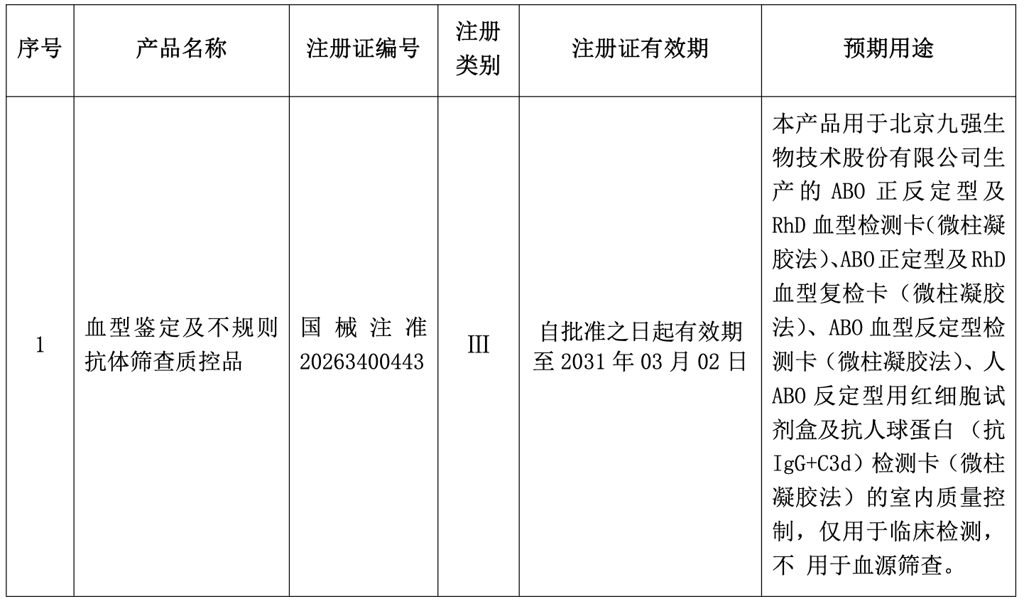 3月4日,九强生物(300406)发布公告,公司近日收到国家药品监督管理局颁发的《医疗器械注册证》,产品名称为:“血型鉴定及不规则抗体筛查质控品”,具体信息如下: