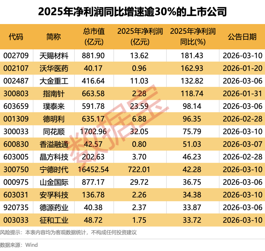 从净利润变动看,共计14家公司2025年全年净利润同比增幅逾30%。天赐材料、沃华医药(维权)、大金重工、指南针净利润实现翻倍增长。其中天赐材料增幅最高,为181.43%。