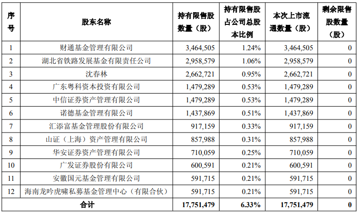 3月11日,世华科技(688093)发布公告,向特定对象发行股票的限售股将于2026年3月19日上市流通。本次上市流通的限售股数量为1775万股,占公司总股本的6.33%。