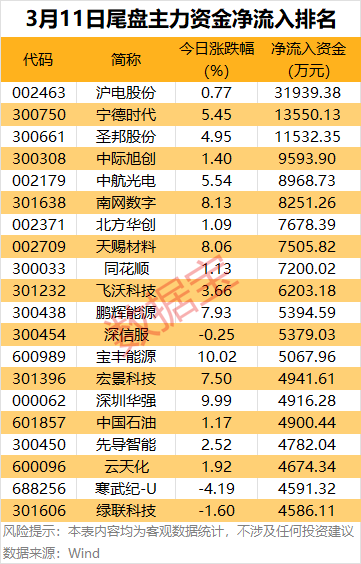 个股方面,沪电股份尾盘主力资金大幅净流入3.19亿元。宁德时代、圣邦股份尾盘主力资金大幅净流入均超1亿元。