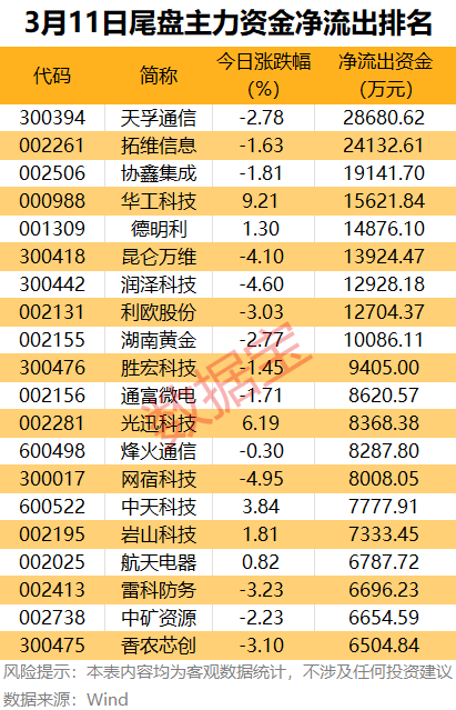 尾盘主力资金净流出方面,天孚通信、拓维信息尾盘主力资金净流出均超2亿元;协鑫集成、华工科技、德明利、昆仑万维(维权)、润泽科技、利欧股份和湖南黄金尾盘主力资金净流出均超1亿元。