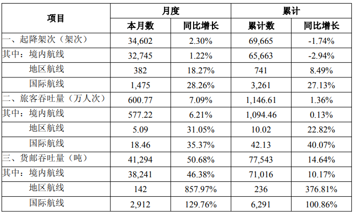 旅客吞吐量方面,2月旅客吞吐量为600.77万人次,同比增长7.09%,累计旅客吞吐量为1146.61万人次,同比增长1.36%。货邮吞吐量为4.13万吨,同比增长50.68%,累计货邮吞吐量为7.75万吨,同比增长14.64%。