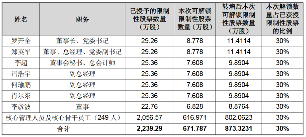此次解除限售的股票数量为873万股,约占公司总股本的0.71%,上市流通日期为2026年3月24日,解除限售的激励对象共计256名。具体情况如下: