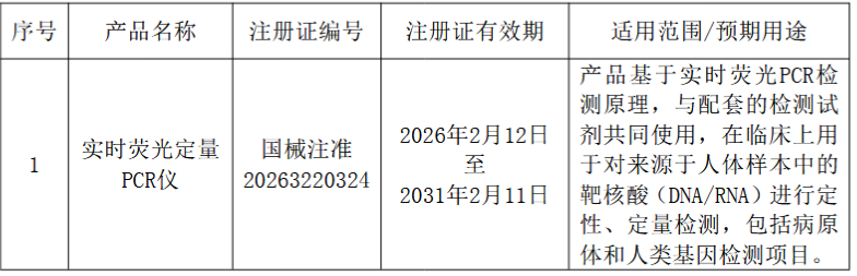 3月23日,科华生物(002022)发布公告,公司的控股子公司西安天隆科技有限公司收到国家药品监督管理局颁发的医疗器械注册证,产品名称为“实时荧光定量PCR仪”。具体情况如下: