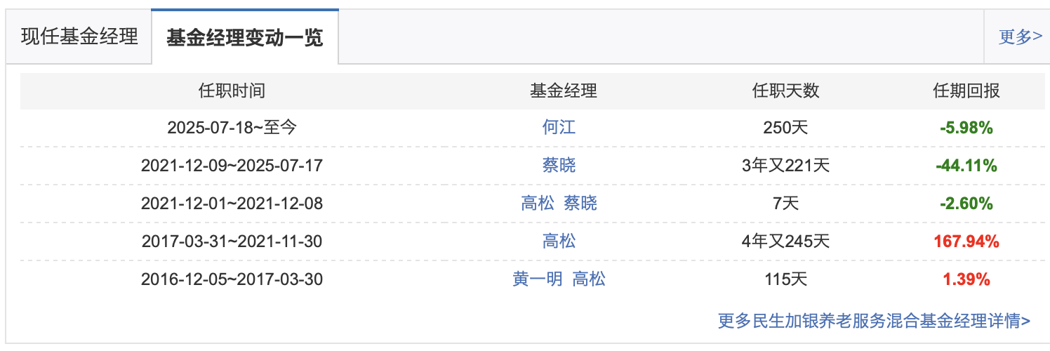 更致命的是管理层与投研层的“双线洗牌”。2025年,公司管理层出现密集调整:5月朱永明升任副总经理,12月任职仅一年多的副总王国栋卸任,丁辉、郑智军等具有民生银行背景的高管迅速接任。另外,投研团队更是出现了多次人事动荡,以成立16年的老牌基金民生加银精选为例,成立至今已更换12位基金经理,人均任职年限不足2年,远低于行业平均水平。基金经理的频繁更迭,导致投资风格频繁切换,也难以形成稳定的投资体系。