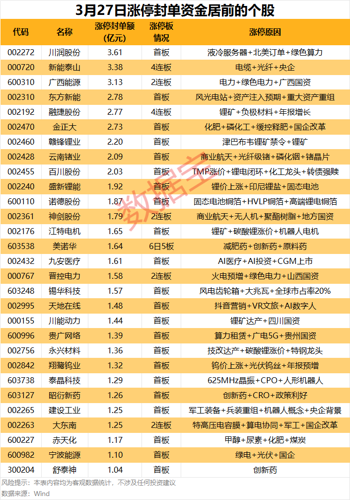 以封单金额计算,川润股份、新能泰山、广西能源(维权)涨停板封单资金居前,分别有3.61亿元、3.38亿元、3.13亿元。